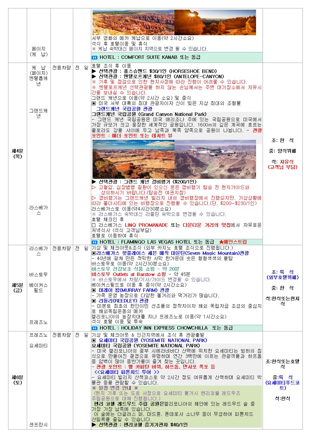 관광지 입장료 : 라스베가스 메인 스트립 호텔 숙박, 그랜드캐년, 자이언캐년, 브라이스캐년, 요세미티 국립공원, 몬트레이 17마일 드라이브코스